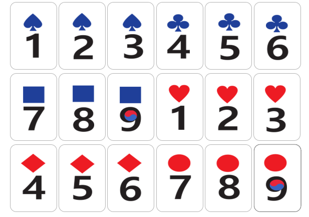 - 숫자카드 18개의 카드를 바닥에 깔아 놓는다.